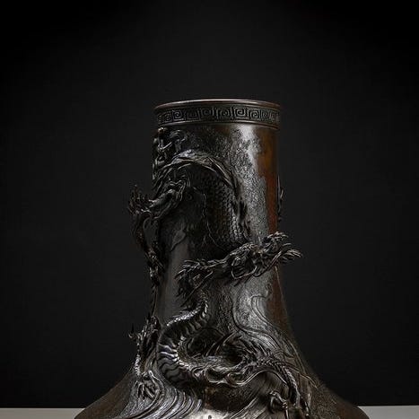 Vigtig og imponerende vase i bronze med dekoration af drager og fugle.