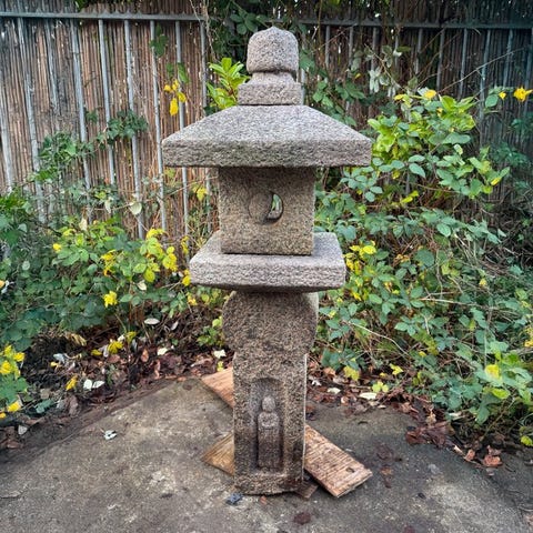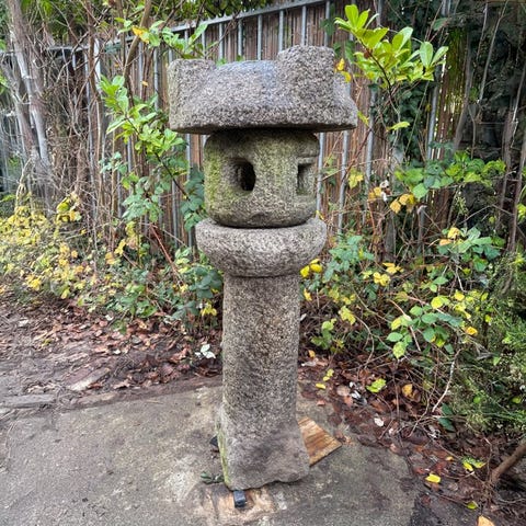 En fin grøn patineret bronze hængelampe 釣灯籠 (tsuri dôrô), elegant formet som et stråtagshus. Hver side har et gittervindue i en anden form: en halvmåne, lozenge, cirkel (sol) og rektangel, nogle indvævet med fine snoede vinstokke.