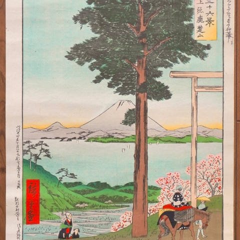 Meiji-tiden ukiyo-e-præg af Utagawa Hiroshige, med titlen Thirty-six Views of Mount Fuji - 1891, platesigneret, 26 × 37 cm, Japan, i god stand. Klik på den blå "gå til varen" knap, for at købe eller byde på denne vare. Den samlede pris vil blive vist inden du afgiver dit bud.