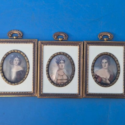Et dekorativt par italienske Barok/Rokoko-tryk på stof, hver i en forgyldt oval ramme, der viser hoffscener fra det 18. århundrede med elegant klædte damer og selskab, i god stand, ikke signeret, original udgave, 20 × 15,5 cm pr. ramme. Klik på den blå "gå til varen" knap, for at købe eller byde på denne vare. Den samlede pris vil blive vist inden du afgiver dit bud.