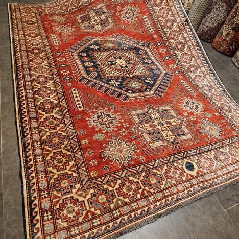Dette er et håndknyttet østligt tæppe lavet af bæredygtige, naturlige materialer. Måden at knytte det på og mangfoldigheden i mønstrene gør dette tæppe unikt og understreger det autentiske og håndværksmæssige karakter.