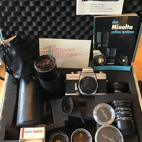 Minolta SR-1 (model V), et manuelt fokuseret SLR-kamera, der bruger standard 35mm film.