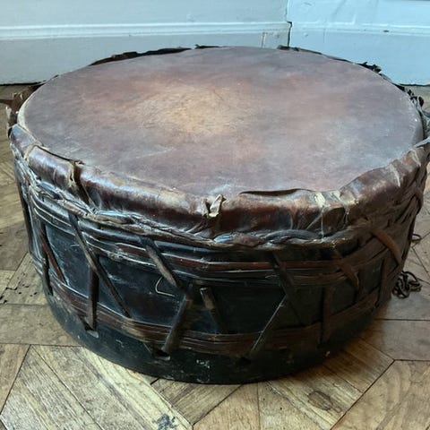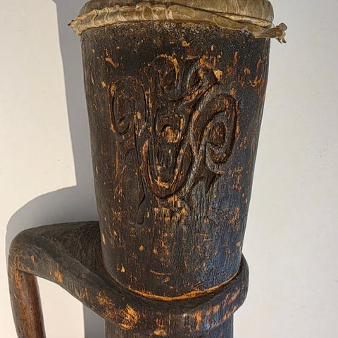 Asmat-tambour fra Vestpapua, lavet af træ og hud, 72 cm høj og 16 cm bred, fra slutningen af det 20. århundrede, i god stand, uden ställ, provenance fra en belgisk privat samling, med ægthedscertifikat. Klik på den blå "gå til varen" knap, for at købe eller byde på denne vare. Den samlede pris vil blive vist inden du afgiver dit bud.