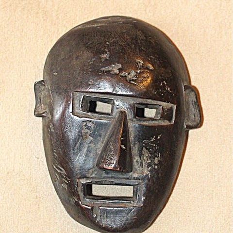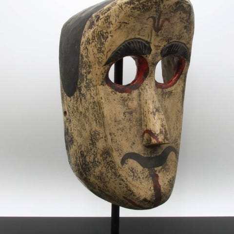 Trancemaskeshaman i træ fra Himalaya, Nepal, udskåret i tungt træ, dateret til begyndelsen af det 20. århundrede, 19 cm høj og 15 cm bred, kommer fra en privat samling, i rimelig stand med slid og gammel patina, udtryksfuldt ansigt med fremtrædende tænder og en let skæv næse, indsamlet i Nepal i 1980’erne af en etnograf. Klik på den blå "gå til varen" knap, for at købe eller byde på denne vare. Den samlede pris vil blive vist inden du afgiver dit bud.