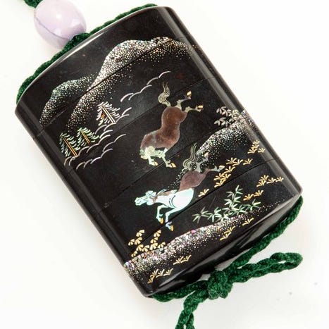 Tre-etagers træ Jubako i Wajima-lak, med udskåret peoni på låget og fire sider, fremstillet i Japan af Wajimanuri, cirka 1980–1990, dimensioner 20 × 20 × 20 cm, i god stand med tegn på ælde. Klik på den blå "gå til varen" knap, for at købe eller byde på denne vare. Den samlede pris vil blive vist inden du afgiver dit bud.