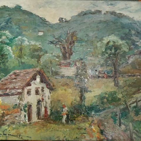 Henry Maurice D’Anty Village Scene (1960), originalt oliemaleri Signeret, et landskab fra 1960’erne med røde, brune, grønne, blå, hvide og flerfarvede nuancer, 46,5 × 55,5 cm, i god stand. Klik på den blå "gå til varen" knap, for at købe eller byde på denne vare. Den samlede pris vil blive vist inden du afgiver dit bud.