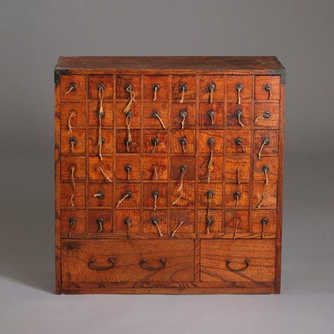 Udført i solidt indfødt kiri (paulownia) træ, fuldstændigt færdiggjort med en dyb, mørkebrun lak med en rødlig undertone og en smuk patina.