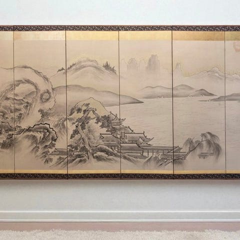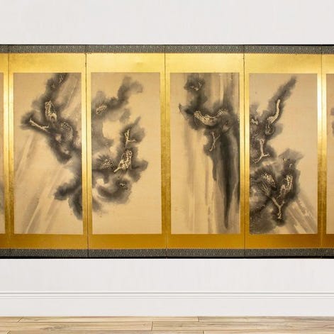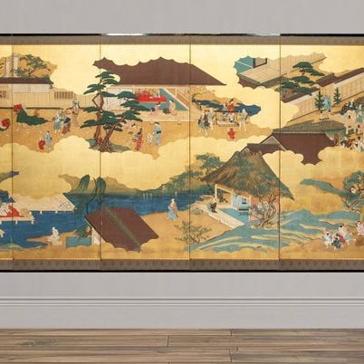 En seks-panel byôbu foldeskærm fra Japan fra tidlig til midt-Edo-perioden (17. århundrede) med guldblad, træ, silke og papir, 327,6 cm bred og 121,1 cm høj, i fremragende restaureret stand og afbildning af Genji-scenen Momiji no Ga fra kapitel 7 med en hofvogn og efterårslandskab, certifikat for ægthed inkluderet. Klik på den blå "gå til varen" knap, for at købe eller byde på denne vare. Den samlede pris vil blive vist inden du afgiver dit bud.
