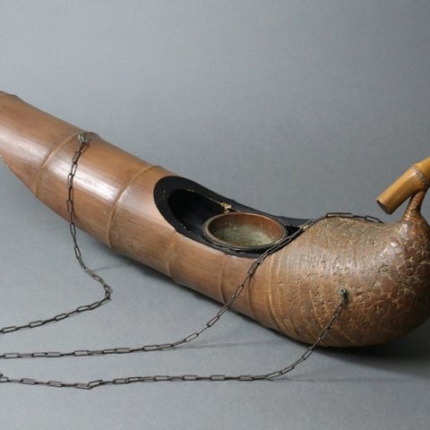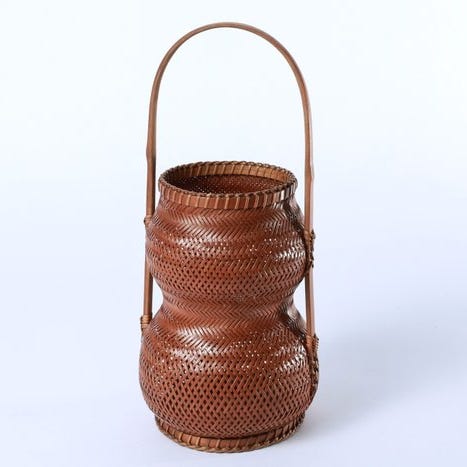Ikebana-vase af bambus med detaljeret wevning og håndtag af træ på siderne, oprindelse Japan, sen Showa-periode (1970’erne–1980’erne), mål H 33 cm x B 16 cm x D 16 cm, vægt 635 g, i god stand med mindre brugsspor. Klik på den blå "gå til varen" knap, for at købe eller byde på denne vare. Den samlede pris vil blive vist inden du afgiver dit bud.