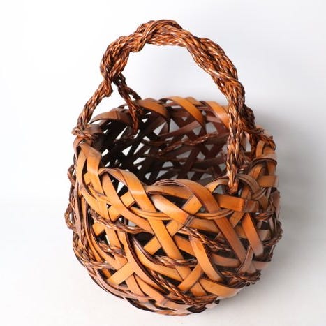 Dette er en imponerende japansk bambus blomsterkurv, der viser forfinet håndværk og en stærk skulpturel tilstedeværelse.