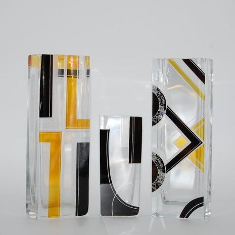 Kunstnerisk deform form. Objektet viser i den øverste del auberginefarvede nuancer med et uregelmæssigt linjemønster. Herunder ses en lys, iriserende stribe, nær bunden et stribemønster i guldnuancer. Fantastisk farvespil og smukke visuelle effekter – især ved passende belysning.