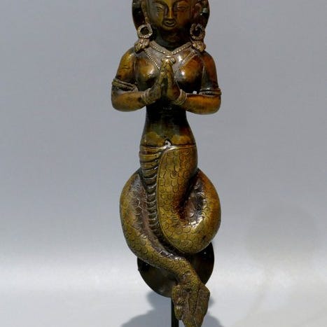 Nepalesisk rituel phurba i messing og bronze med krystal, ca. 34 cm høj, anden halvdel af det 20. århundrede, enkelt stykke fra privat samling, i god stand. Klik på den blå "gå til varen" knap, for at købe eller byde på denne vare. Den samlede pris vil blive vist inden du afgiver dit bud.