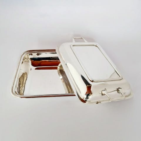Klassisk sølvpletteret forretfad fra Christopher Johnson & Co., lavet i E.P.N.S. (Electro Plated Nickel Silver). Det har en rektangulær form med et tilpasset låg og et elegant perlerammehåndtag, hvilket giver det et tidløst, traditionelt udseende.