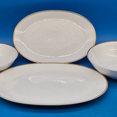 Til salg står et elegant, klassisk porcelænsservise fra Schumann Arzberg, fremstillet i Bayern, Tyskland. Serviset imponerer med sin tidløse hvide glasur og en fin rundgående guldrand. Manufakturmærket på undersiden er tydeligt bevaret.