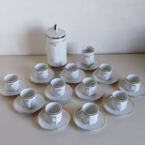 Til salg er et klassisk porcelænsservice fra den berømte Mitterteich-fabrik i Bayern, Tyskland. Servicet imponerer med sit elegante design med buede kanter, en koboltblå kantdekoration med fine gulddetaljer og et tidløst hvidt midterstykke, der understreger sættets høje kvalitetskarakter.