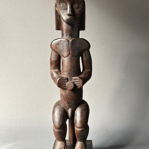 Lille Kota Songo-relikvære fra Gabon i træ og metal med øjne, der ser ud som knogle, 21 cm høj eksklusiv fod, 7 cm bred og 5,5 cm dyb, sendt med fod og i fremragende stand. Klik på den blå "gå til varen" knap, for at købe eller byde på denne vare. Den samlede pris vil blive vist inden du afgiver dit bud.