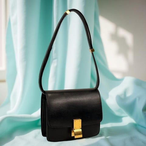 Opdag tidløs elegance med Celine Classic Box Small Shoulder Bag i sort læder. Fremstillet af luksuriøs glat kalveskind og udstyret med en slank guldfarvet tryk-lås, kombinerer dette stykke moderne minimalisme med ikonisk parisisk design.