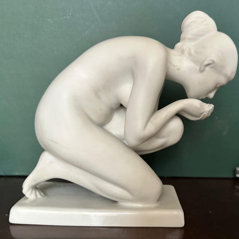 Porcelæn statuette med mat sort glasur af Tapio Wirkkala for Rosenthal Studio Line, Tyskland, ca. 1960–1970, afbildet dyr, titel 'Uccello', mål 20 cm bred, 8 cm høj, 6 cm dyb; i god stand med små aldersmærker og pletter. Klik på den blå "gå til varen" knap, for at købe eller byde på denne vare. Den samlede pris vil blive vist inden du afgiver dit bud.