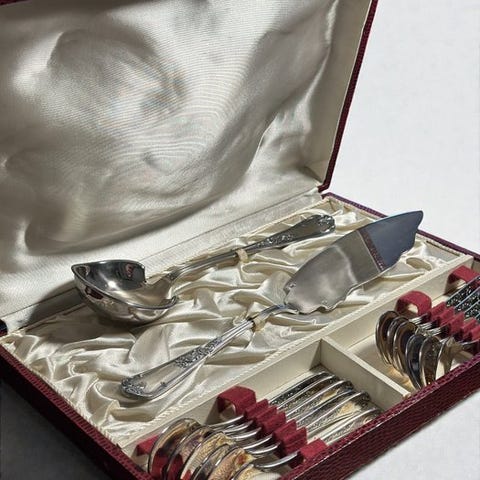 Splendid og meget luksuriøst service i engelsk bone china produceret af den berømte manufaktur Spode, dekoreret med det elegante mønster 'Rockingham', et af de mest elegante og eftertragtede mønstre fra det 20. århundrede. Servicen præsenterer et livligt væv af frugt, blomster og blade, gengivet i en skinnende og skarp flerfarvetone. Den formede kant er udsmykket med en dobbelt guldramme og den karakteristiske bladkrans: en særlig værdifuld dekoration, fordi den gule farve, selvom den ligner en 'okker' nuance, faktisk er et lyst guldbedrag håndpåført, hvilket giver stykkerne en overlegen elegance og høj håndværksmæssig kvalitet.