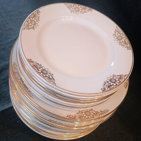 Tallerkenservice produceret af den tyske virksomhed Scherzer i 80'erne/90'erne, specialudgave til virksomhedens 50-års jubilæum.