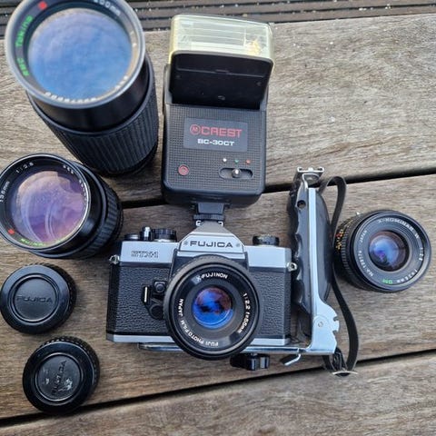 Fuji Super Fujica 6 er et klassisk mellemformat foldkamera designet til 6×6 cm billeder på 120 film. Kendt for sit kompakte foldedesign, solide metalbygning og højkvalitets Fujinon-objektiv, leverer det skarpe, kontrastfulde billeder med en smuk vintage karakter. Dets bærbarhed og enkelhed gør det til en favorit blandt filmentusiaster, samlere og fotografer, der nyder klassisk mellemformatfotografering.