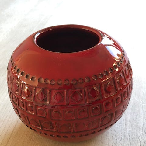 Vintage 1960'erne Alvino Bagni rødt keramikkrus, italiensk keramik, mid-century modern fiskedesign, Bitossi-era boligindretning.