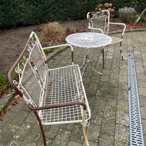 Beige have-/antikt stil hængekøb fra stål, oprindelse Nederlandene, estimeret periode 2010–2020, dimensioner: bredde 72 cm, højde 55 cm, dybde 35 cm, siddehøjde 40 cm, vægt 5,2 kg. Klik på den blå "gå til varen" knap, for at købe eller byde på denne vare. Den samlede pris vil blive vist inden du afgiver dit bud.
