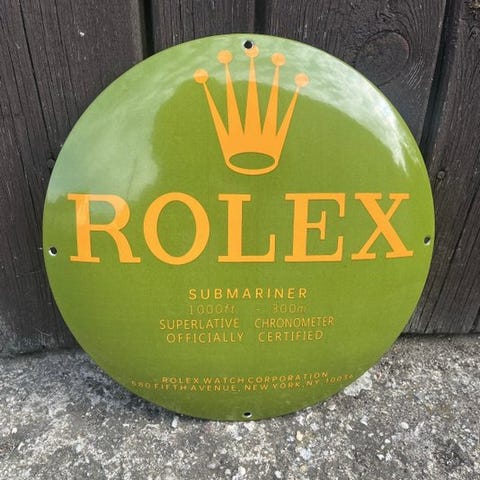 Campbells Condensed Rolex Soup emaljeskilt, en kopi i fremragende stand fra 2010–2020, lavet af emalje på metal, måler 60 × 50 cm. Klik på den blå "gå til varen" knap, for at købe eller byde på denne vare. Den samlede pris vil blive vist inden du afgiver dit bud.