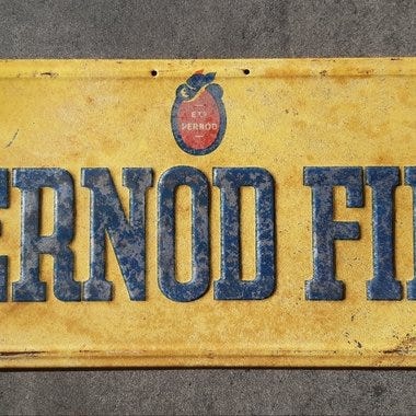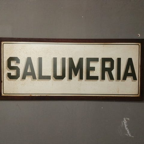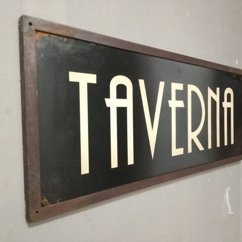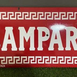 Jernskilt fra Marchesini Insegne Rovigo, designet af Enoteca, vintage‑replika fremstillet i Italien, mål 100 × 40 × 2,5 cm, vægt 8 kg, brugt i god stand med små aldersmærker og pletter. Klik på den blå "gå til varen" knap, for at købe eller byde på denne vare. Den samlede pris vil blive vist inden du afgiver dit bud.