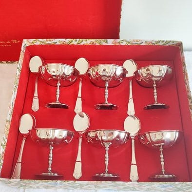 Vintage sæt med 6 isglas, frugt, fløde, dessert, alkohol, smagsprøver, amuse-bouche, champagne ... af tallerken, tallerken, ladeplade, skåle, underglas, borddækning og disse 6 flade skeer. Ske. Og 1 stor serveringsske på 23 cm i længden.
