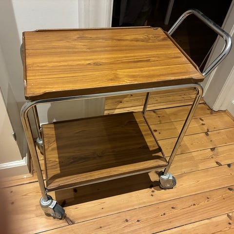 Den har fire hjul og kan bruges som en bar eller sidebord.