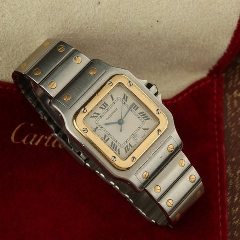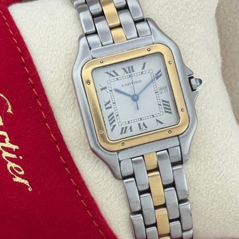 Cartier Panthé̀re Jumbo 8395 herre quartzur, kasse 29 mm i guld/stål med armbånd i guld/stål, hvid urskive, vandafvisning 30 m (ikke garanteret), meget god stand med mindre brugsspor; ingen æske eller papirer. Klik på den blå "gå til varen" knap, for at købe eller byde på denne vare. Den samlede pris vil blive vist inden du afgiver dit bud.