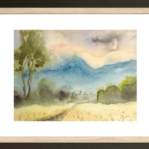 Akvarel med dominans af blå og grøn, der forestiller et landskabsbillede af en dal, behandlet med brede våde penselstrøg og subtile kromatiske overgange.