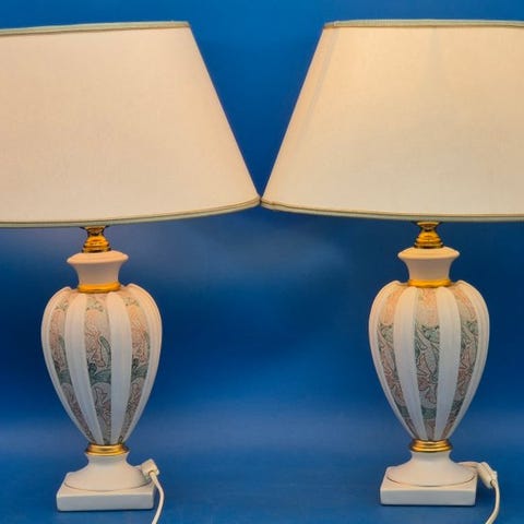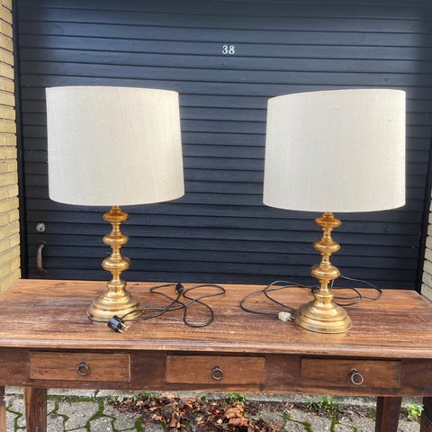 Til salg står et klassisk par bordlamper af messing med kannelerede søjler og profilerede sokler, der i deres formsprog minder om traditionel søjlearkitektur. De varme tonede stofskærme supplerer ensemblet harmonisk og skaber et behageligt, blødt lys.