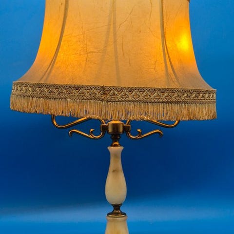 Kannelerede midtersøjler på afstufet, kvadratisk sokkel; elegante, let buede stofskærme
