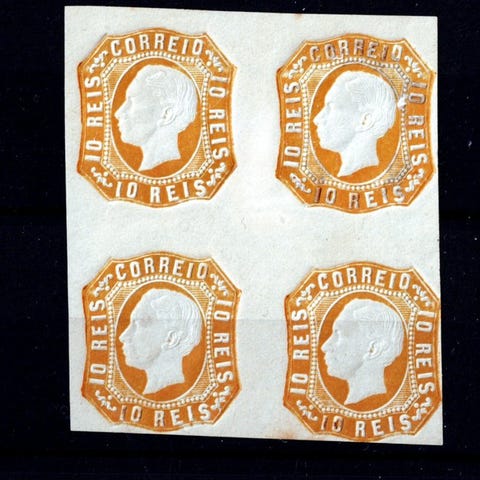 Portugal, 1866/67 – D. Luís I. Buet bøjning, ikke-perforeret; MF20, 10 réis, gul, glat papir, ikke-perforeret, i næsten ny stand med original gum og hængselmærke, uden reparationer og med oxidationsspor på bagsiden. Klik på den blå "gå til varen" knap, for at købe eller byde på denne vare. Den samlede pris vil blive vist inden du afgiver dit bud.