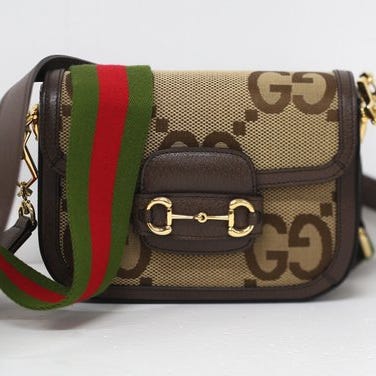 Horsebit 1955 skuldertaske i beige belagt canvas med mørkebrune læderdetaljer, fremstillet i Italien, med støvpose og to ekstra knapper. Klik på den blå "gå til varen" knap, for at købe eller byde på denne vare. Den samlede pris vil blive vist inden du afgiver dit bud.