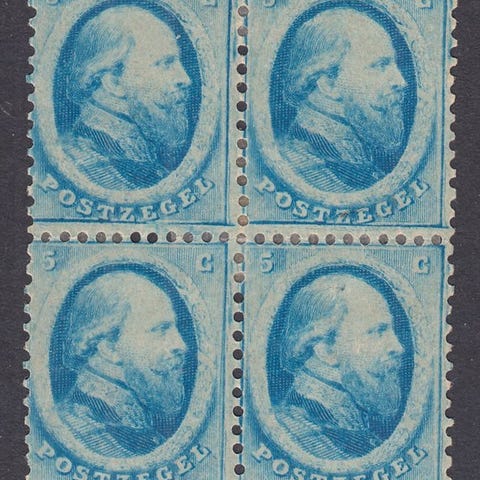 Frem fra 1852, blok af fire Koning Willem III-frimærker, NVPH 1q, plade VI positioner 18–19 og 23–24, afprøvet (gestempeld) med attest fra Nederlandsche Keuringsdienst dateret 14-10-2025. Klik på den blå "gå til varen" knap, for at købe eller byde på denne vare. Den samlede pris vil blive vist inden du afgiver dit bud.