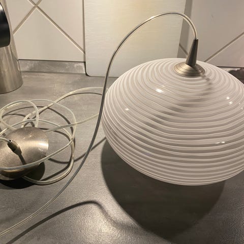 Pendel udvendig sort glas , indvendig hvidt glas som giver et fint lys, højde ca 17 cm (glas del) diameter ca 13 cm. PT ført sammen i fælles roset, og kan hænge forskudt, lofts monterings beslag til baldakiner / cylinder roset medfølger, fine og velholdte uden skår eller andet