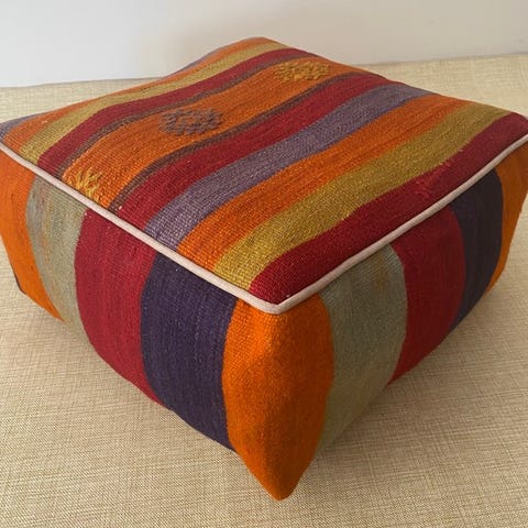 Denne autentiske puf / stol / bænk er lavet af 100% håndvævet Kelim, og benene er af træ. Meget ideel til din stue, soveværelse eller køkken.