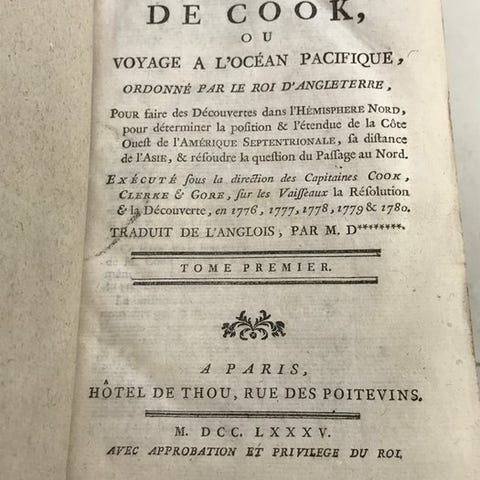 Smuk udgave fra det 18. århundrede givet i Lausanne, af beretningen om ANDEN REJSE af James Cook, i 6 bind i in-8 med ensartede indbindinger.