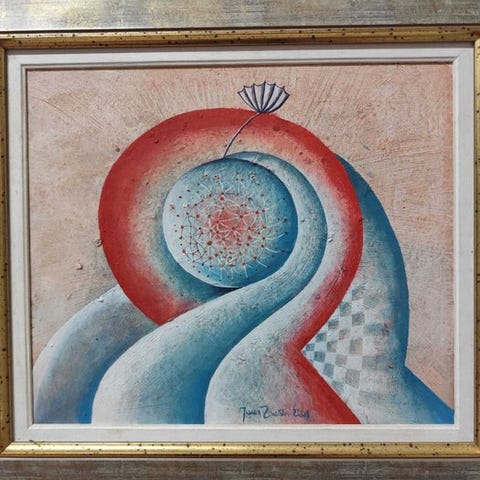 Jana Zanoskar original fra 1999, akrylmaling på panel med titel Fiori insoliti, 40x40 cm, håndsigneret og sælges med ramme. Klik på den blå "gå til varen" knap, for at købe eller byde på denne vare. Den samlede pris vil blive vist inden du afgiver dit bud.