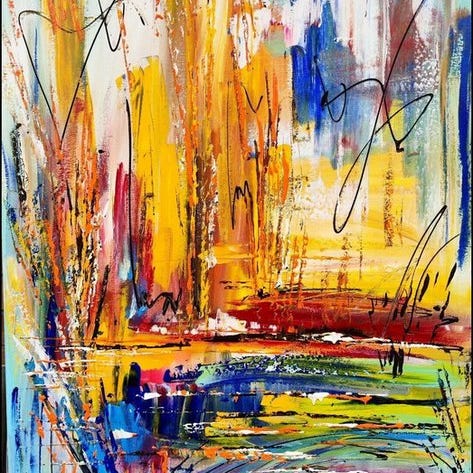 Dette værk præsenterer en kvindelig figur indhyllet i en atmosfære med en intens følelsesmæssig og symbolsk ladning. Den dominerende brug af blå nuancer på huden står i kontrast til en varm orange baggrund, hvilket skaber en visuel spænding, der understreger scenens introspektive karakter. Den hånd, der delvist dækker ansigtet, introducerer en tvetydig gestus, der ligger mellem beskyttelse og kontrol, og inviterer til en åben og personlig fortolkning for betragteren.