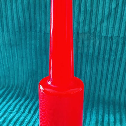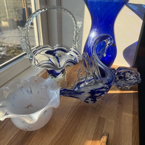 Vase i hvidt glas med blå blomster dekorationer. Har en bølget kant og en rund form med detaljerede mønstre. Incl brænderør. 21 cm høj og ø mål i bund af skærm er 7 cm.