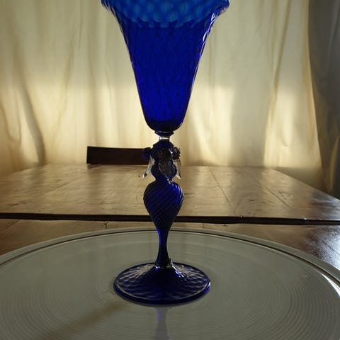 Elegant vintage Murano-glaskelase med etiket og signatur i bunden.