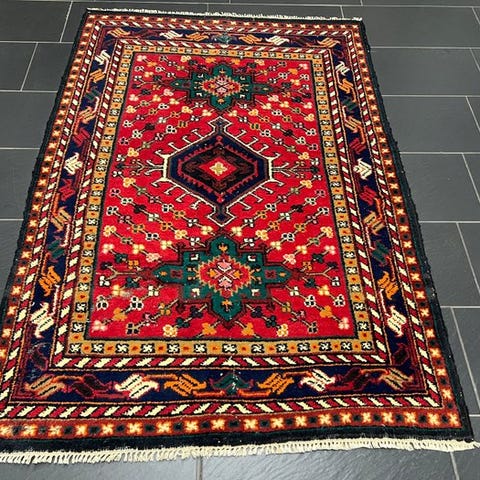 Dette er et håndknyttet østligt tæppe lavet af bæredygtige, naturlige materialer. Måden at knytte det på og mangfoldigheden i mønstrene gør dette tæppe unikt og understreger det autentiske og håndværksmæssige karakter.