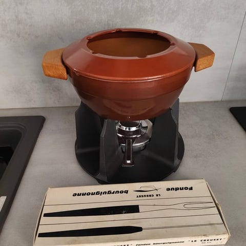 Sæt en fondue Le Creuset, en emaljeret støbejernspande. Meget flot model. God stand, se billeder.