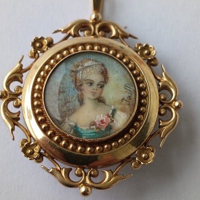 Den er prydet med en smuk karneol udskåret i profil af en kvinde.