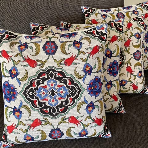Fire vævede tapaskudder, fremstillet i Tyrkiet af lin, bomuld og silke, hver 43 × 43 cm, i næsten ny stand (2020+), med vævede motiver og skjult lynlås, sendt tomme til fyld af køber. Klik på den blå "gå til varen" knap, for at købe eller byde på denne vare. Den samlede pris vil blive vist inden du afgiver dit bud.