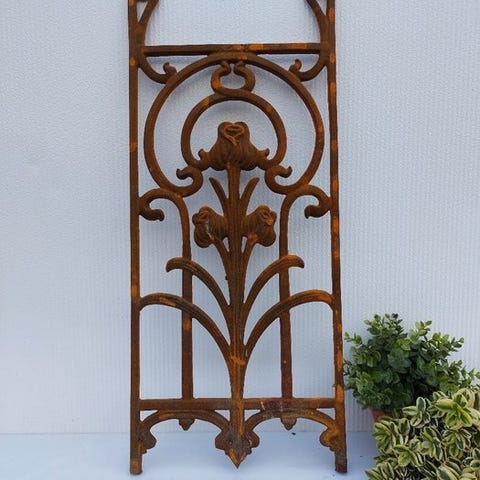 Metalt vinduesgitter i støbt messing til en træ dør i forvejen, anslået periode 2010–2020, 80 cm høj, 30 cm bred, 3 cm dyb, ca. 4,6 kg, fire monteringspunkter, europæisk oprindelse, i god brugt stand. Klik på den blå "gå til varen" knap, for at købe eller byde på denne vare. Den samlede pris vil blive vist inden du afgiver dit bud.